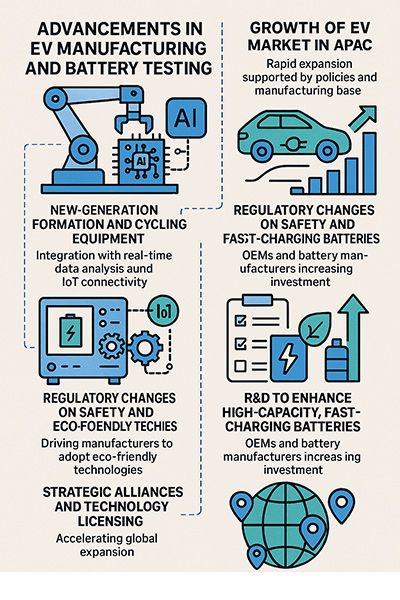 · Растущие инвестиции производителей оригинального оборудования и аккумуляторов в НИОКР способствуют прорывам в тестировании аккумуляторов большой емкости и быстрой зарядки, влияя на конкурентоспособность рынка.